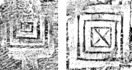 飾窓文は、二重の窓枠状の四角形を中心に飾がつくことからこの名前をつけました。2種類あります。重方文は四 角形を三重に配置したもので、栄一は三升文と言っています。2種類あり、一つは中心にXを入れています。下図 の重方文は、羽子板状の柄の当たりが明確で、構造がよくわかります。 |
