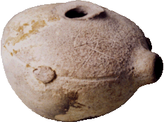 | 関市下有知の向中野古墳出土と伝わっています。この古墳に関わる栄一の記録は、まだ確認していません。私は『関市史』に記述されているこ と以外に承知しておりません。 この資料は真っ二つに割れており、現重量は52gであることから、本来は100g余りと思われます。首にぶら下げるには重過ぎます。 大きさは直径47mm、高さ43mmで、全体を3段に分けて、それぞれを8分割して箆で文様を入れています。上下の孔の周囲は菊座状の部位を 表していることから、このモデルとなった製品が石製やガラス製でなく、金銅製の空玉だったのではないかと思われます。孔は直径5mmの円孔 で、太い紐を通したと思われますが、用途は分かりません。 胎土や色調などから、時期は7世紀と推察します。他に見たことのない珍品で、これも美濃須衛工人の作品です。 |